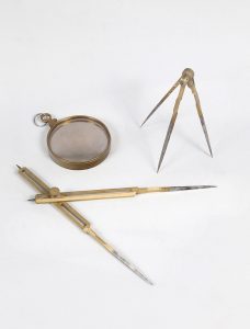LOT DE 3 OBJETS. XIXe. Ensemble d'instruments scientifiques comprenant un très beau miroir de poche sorcière convexe et concave, un compas de réduction (24,5 cm), un compas à trois branches à pointes sèches (14 cm). Diamètre du miroir 8 cm