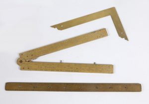 COMPAS. BUTTERFIELD, Paris, XVIIIe, 17,6 cm, laiton. Compas de proportion en laiton, signé PARIS BUTERFIELD XVIIIe. On joint une équerre en laiton (13,1 cm x 7,6 cm) et une règle en laiton (24,3 cm).
