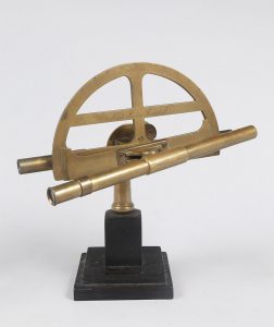 ARPENTAGE. Nebel Paris au Butterfield, XIXe, 22 x 25,5 x 12,2 cm, laiton, bois. Appareil d'arpentage articulé à 2 lunettes de visée en laiton signé NEBEL PARIS AU BUTTERFIELD sur un trépied en bois noirci postérieur.