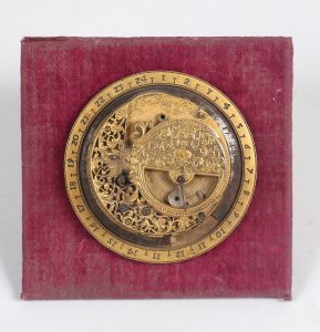 CADRAN D'HORLOGE EN BRONZE. Diam. 5,8 cm. Raffiné mécanisme d'horloge signé Alseling Fecit. Présenté sur une base en bois recouverte de velours violet.