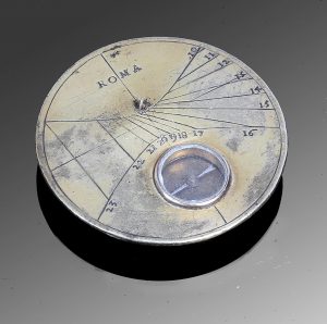 CADRAN SOLAIRE ITALIEN. Diam. 5 cm, laiton, verre, acier. Cadran solaire de forme ronde en laiton doré dans son étui gainé de cuir marron. Laiton un peu piqué. Charnière de l'étui déchiré du coté droit. Manque le gnomon. Bon état général....