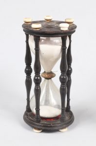 SABLIER. XVIIIe, 18,5 x 9 cm, bois, verre, ivoire, sable, velours. Élégant sablier de marine en ébène à 5 colonnes en balustre tournées. Le plateau circulaire est soutenu par 5 pieds en ivoire pour chaque face. Les 2 ampoules sont séparées...