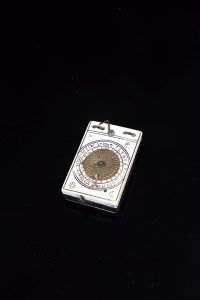 épaisse, est composée d'une tablette de bois, recouverte au-dessus et en-dessous d'une lamelle en ivoire. Elle abrite la boussole. L'échelle horaire du cadran à fil-axe (5-12-8) est gravée en noir avec les demi-heures marquées par des points et décorées de 3 motifs en rouge. L'intérieur du couvercle est un cadran vertical à fil-axe avec une échelle horaire VI-XII-VI gravée en noir et décorée de trois soleils dans un cercle à double filet. Le dessus du couvercle comporte une volvelle lunaire en laiton entourée d'une échelle circulaire graduée de 1-12 deux fois et de 1-29. La volvelle porte le motif gravé typique de la maison Karner, une Lune en forme de profil humain graduée de 1-12 deux fois avec un index. Sur chaque angle de cette face sont gravés 4 soleils identiques à ceux de l'intérieur. Deux crochets relient les tablettes. Présence d'un crochet sur le couvercle pour maintenir l'instrument ouvert. Manque le crochet inférieur pour fermer l'instrument. Bel état.