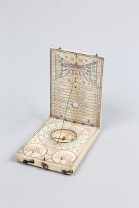 CADRAN DIPTYQUE MULTIPLE. KARNER, XVIIe, 10 x 7 x 1,5 cm, ivoire, acier, laiton, verre. Cadran solaire portatif diptyque, constitué de deux fines tablettes en ivoire polychrome gravé reliées par deux charnières métalliques. Le gnomon est...