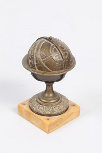 VIDE POCHE EN BRONZE. XIXe, H. 13,5 cm, bronze, marbre. Vide poche en bronze à décor d'un globe céleste, terrasse de marbre. Charnière du couvercle remplacée par une aiguille.
