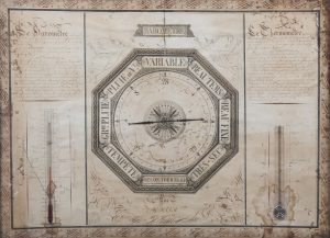 BAROMÈTRE. c. 1800, 72 x 93 x 6 cm. Baromètre en papier sous cadre en bois noirci. Il s'agit d'un instrument de mesure, utilisé en physique et en météorologie, qui sert à mesurer la pression atmosphérique. Signé Mozella. Étonnant décor...