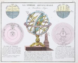 Une planche figurant les plans hémisphères du globe céleste?; une planche représentant une sphère armillaire entourée des schémas figurant les systèmes de Copernic et de Ptolémée.