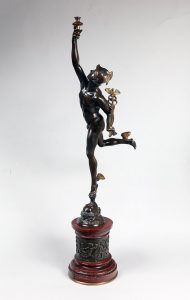 BOLOGNE (d'après Jean de). Mercure. Sculpture en bronze patiné représentant Mercure / Hermès. Il s'agit de la célèbre pose en arabesque de Mercure soufflé par Zéphyr avec son caducée. Il repose sur un socle cylindrique en marbre rouge...