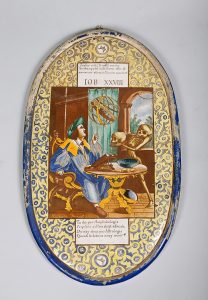 [HOLBEIN, D'après la danse des morts dessinée par] L'astrologue ou le triomphe de la Mort. Importante plaque ovale en faïence à décor au centre d'une scène humaniste illustrant l'alchimiste ou l'astrologue, occupé à contempler un globe...