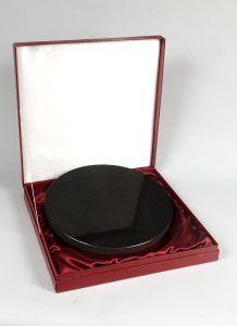 33), servant d'écrin à un plateau sphérique de marbre noir poli enveloppé par un tissu satiné bordeaux (diamètre?du plateau : 30 cm / épaisseur : 2 cm).