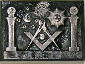 Cachet maçonnique. Figure gravée sur cuivre de forme rectangulaire, montée sur bois (460 x 340 mm). Cachet illustrant le temple maçonnique au travers de ses principaux emblèmes : œil, compas, équerre, lettre G, colonnes, soleil, lune…
