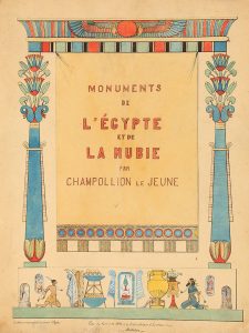 Il s'agit d'une copie du tome de planches des " Monuments de l'Egypte et de la Nubie, d'après les dessins exécutés sur les lieux sous la direction de Champollion-Le-Jeune et les descriptions autographes qu'il en a rédigées, publiés sous les auspices de M. Guizot et de M. Thiers, ministres de l'Instruction publique et de l'Intérieur, par une Commission spéciale " (Paris, Firmin Didot Frères, 1835) - Ce monumental ouvrage, dont la publication s'étendit sur plus de 40 ans, parut en édition originale posthume. Commencée sous la direction de l'égyptologue français Emmanuel de Rougé (cf. p. 607 du 1er vol.), elle s'acheva sous celle de Gaston Maspero (1846-1916), autre éminent égyptologue français, qui signe la préface de la 7e livraison. Ricci 83. Kettel 00392 & 00318.