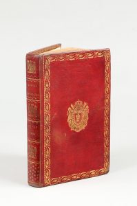 de 3 aigles en fleuron, d’un semé d’étoiles en queue, titre, date, filets, le tout doré, plat bordés d’une roulette florale et d’un pointillé dorés, armes dorées au centre, roulette aux coupes et bords des contreplats, tranches dorées (qq. frottements et taches sans gravité, mouillure très claire, un coin manque p. 29 affectant qq. lettres, la carte dépliante absente comme souvent).