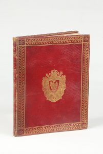 jusqu'à 56), portrait gravé de Napoléon et Marie-Louise en frontispice, reliure de l'époque plein maroquin rouge, dos lisse orné de 5 fleurons (étoile, main tenant une plume, N couronné, couronne de lauriers, lyre), plats bordés d'une roulette de feuilles de laurier encadrée d'un double filet, fleurons aux angles, armes impériales au centre, le tout doré, roulette aux coupes et bords des contreplats, tranches dorées, gardes de satin moiré [P. Lefebvre] (mors sup. fendu en queue sur 2 cm., coiffe de tête usée, petits accrocs au plat inf., rousseurs au front., qq. traces digitales en marge).