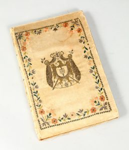 reliure de l'époque satin ivoire brodé, fleurettes et filets au dos, armoiries de Napoléon brodées en fil d'or et d'argent au centre de chaque plat, dans un encadrement floral en couleurs (défauts, forte usure des coupes et du dos avec lacunes, les armoiries bien conservées).