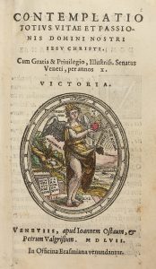 [Livre du XVIe siècle]. [DÜRER (Albrecht)]. Contemplatio totius vitae et passionis Domini Nostri Iesu Christi. Venezia, apud Ioannem Ostaum, et Petrum Valgrisium. In Officina Erasminiana venundantur, 1557. In-8, 103 p., marque typographique à la...