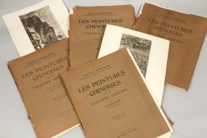 Important ouvrage de référence sur la peinture chinoise ancienne, publié dans la collection des Annales du Musée Guimet. Chacun de ces 4 volumes est complet, l'ensemble réunissant 160 planches [sur 200], avec le texte correspondant (41 p., puis pp.58 à 112), les 4 pages et titre, et [2] f. d'index à la fin du dernier tome.
