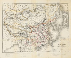 HUC (Evariste). Souvenirs d'un voyage dans la Tartarie, le Thibet et la Chine pendant les années 1844, 1845 et 1846. Paris, Le Clere, 1853. 2 volumes in-12, 435 p. + [2] f., 518 p., 1 grande carte dépliante h.-t. aux limites coloriées, reliure...