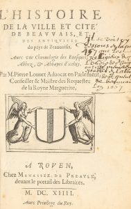 LOUVET (Pierre). L'histoire de la ville et cité de Beauvais, et des antiquitez du pays de Beauvaisis. À Rouen, chez Manassez de Preaulx, 1613-1614. 4 parties en un vol. in-8, [7 (sur8)] f., 604 [i.e. 610] p., reliure du XVIIIe siècle demi-basane...