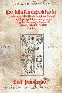 Edition incunable d'une des œuvres d'exégèse biblique composées par Nicolas de Lyre (1270-1349), théologien franciscain qui s'illustra par sa connaissance de la langue hébraïque, au point qu'il lui prête des origines juives. Il est notable que ses travaux, composés dans les années 1320, influencèrent toutes les interprétations de la Bible dans les deux siècles qui suivirent, en particulier les œuvres de Martin Luther. Le texte est imprimé sur 2 colonnes, encadré du commentaire.
