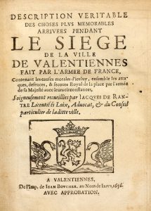 RANTRE (Jacques de). Description véritable des choses plus mémorables arrivées pendant le siège de la ville de Valentiennes fait par l'armée de France, contenant les causes morales d'iceluy, ensemble les attaques, défences, & secours royal de...