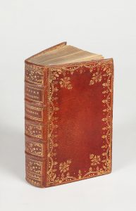 p., [2] f., reliure de l'époque plein maroquin havane, dos à 5 nerfs, 2 titres dorés, fleurons, plats bordés d'une dentelle aux petits fers, avec fleurons angulaires, filet doré aux coupes, roulette dorée aux bords des contreplats, tranches dorées (2 premiers cahiers déréglés).