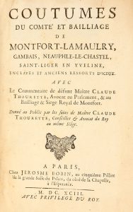 THOURETTE (Claude), [éd.]. Coutumes du comté et bailliage de Montfort-Lamaulry, Gambais, Neauphle-le-Chastel, Saint-Liger en Yveline, enclaves et anciens ressort d'iceux. À Paris, chez J. Bobin, 1693. In-8, reliure de l'époque veau brun glacé,...