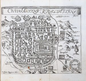blanc), 18 planches gravées sur cuivre, dont 5 dépliantes (dont une carte de la Terre Sainte), reliure de l'époque peau de truie sur ais de bois, dos à 3 nerfs et muet, plats estampés à froid, fermoirs de cuivre (reliure frottée, l'estampage ne paraît presque plus, étiquettes au dos, le corps du volume déformé avec qq. f. en ressaut au centre, une planche déchirée sans manque, auréoles et salissures).