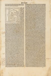 1 volume (su 4) in-folio (mm 348x238). Carte [299], la prima bianca. Segnatura: a10 b8 c-l10 m10+1 n-z [et] [con] [rum]10 Aa-Dd10. Testo e commento in caratteri gotici su due colonne e 74 linee. Con una grande iniziale incisa a carta a2r raffigurante Nicolaus de Lyra in lettura e molte xilografie nel testo, delle quali una a piena pagina. Lievi gore d'acqua sparse, qualche strappetto e qualche forellino marginale, due piccoli fori di tarlo nel testo all'ultimo quaderno, rinforzato da brachette interne. Legatura cinquecentesca in piena pergamena con dorso quasi del tutto perduto e allentata. Molte glosse di antica mano al testo.  Il solo primo volume di questa importante Biblia con le postille di Nicolaus de Lyra. Cfr. BMC V, 437; Goff B-616; GW 4291; Hain-Copinger 3163.