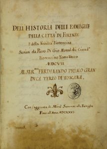 Monaldi Piero [da], Dell'Historia delle famiglie della città di Firenze e della Nobiltà fiorentina [...] Tomo unico 1607 [...] con l'aggiunta di Mons.r Sommai alle famiglie fino all'anno 1626. XVII secolo.
