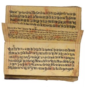 Manoscritto a soffietto su cartoncino color ocra (mm 145x2800). Scritto recto e verso in inchiostro nero e rosso, specchio di scrittura incorniciato da duplice filetto in inchiostro rosso. Minimi difetti. Legatura in piena pelle, lievemente lisa.