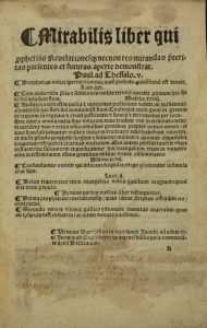 Mirabilis liber qui Prophetias Revelationesq[ue]; nec non res mirandas p[re]teritas, presentes et futuras aperte demonstrat... Veneunt Parrhisius: ab Engleberto de Marnef, 1523 s.d. (Al colophon:) imprime a paris: 1523.