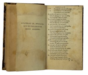 In-8° (mm 154x90). Carte [248]. Con 1 raffigurazione dell'Inferno a doppia pagina e 3 schemi dei peccati, il tutto inciso in legno nel testo. Frontespizio con i margini superiore e inferiore ricostruiti, piccolo reintegro al margine di carta a2 e v8 e qualche sporadica macchia nella seconda parte del volume, ma nel complesso buon esemplare ad ampi margini. Legatura ottocentesca in mezza pelle con piatti marmorizzati e titoli impressi in oro al dorso. Ex-libris applicato al contropiatto anteriore e numerose postille di mano coeva alle carte, la stessa mano ha trascritto alcune terzine al foglio di guardia posteriore. Edizione della collana di opere in volgare stampate in ottavo dal Paganini nell'ultimo suo periodo di attività; ormai superata la tradizionale datazione (1506), gli studiosi collocano l'edizione fra il 1527-1533; cfr. Mambelli, 21: «assai rara e pregevole. Il Witte [...] scarta la data 1506 e assegna invece a questa edizione una data posteriore all'agosto 1515»; Nuovo, 186-187.