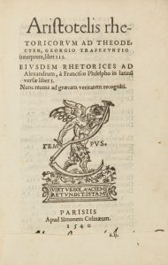 Aristoteles, Rhetoricorum ad Theodecten, Georgio Trapezuntio interprete, libri III. Parisiis: apud Simonem Colinaeum, 1540.