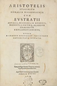 Aristoteles, Moralia Nichomachia cum Eustratii Aspasii, Michaelis Ephesii, nonnullorumq. Aliorum Graecorum explanationibus, nuper a Ioanne Bernardo Feliciano latinitate donata. Venetiis: Apud haeredes Lucaeantonii Iuntae Florentini, 1541.