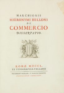 Belloni Girolamo, De commercio dissertatio. Romae: ex typhographia Palladis, excudebant Nicolaus et Marcus Palearini, 1750.