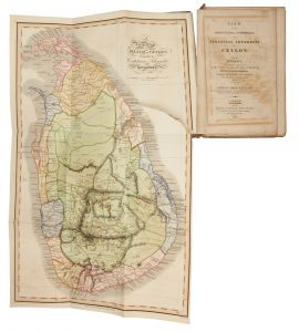 In-8° (mm 220x150). Pagine [14], 577, [3] con una carta geografica in coloritura coeva più volte ripiegata in principio di volume. Esemplare parzialmente sfascicolato, con bruniture e macchie diffuse alle carte. Legatura in cartone con titolo stampato su tassello in carta al dorso. Staccato il piatto anteriore, spellature al dorso, minime fratture agli angoli. Prima edizione. Bella e interessante opera sull'assetto politico ed economico ottocentesco dello Sri Lanka.