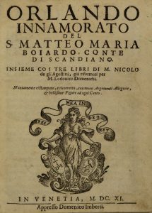 Boiardo Matteo Maria, Orlando innamorato [...] insieme coi tre libri di M. Nicolo de gli Agostini, già riformati per M. Lodovico Domenichi, nuovamente ristampato, e ricorretto, con nuovi argomenti allegorie, e bellissime figure ad ogni canto. In...