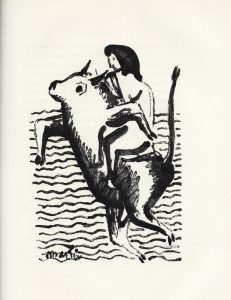 Bontempelli Massimo, Viaggio d'Europa. Con litografie di Arturo Martini. Milano: Edizioni della Chimera, [1942] (Al colophon:) [Verona]: Giovanni Mardersteig nei torchi della sua Officina Bodoni, 1942.