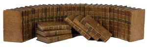 52 [di 54] volumi in-12° (mm 165x100). Numerazione varia. Con nel complesso 255 tavole calcografiche in coloritura coeva di riproduzione degli animali descritti dall'Autore e una bella carta geografica più volte ripiegata. Esemplare con bruniture, fioriture e gore d'acqua ad alcuni volumi. Strappi a rare carte, talvolta con perdita di testo. Mancanti i tomi XIII e XIV dei quadrupèdes. Legatura uniforme in pieno vitello nocciola con titolo impresso in oro su tassello al dorso. Alcune spellature ai piatti. (52). Edizione in formato tascabile della più importante opera di Buffon. L'opera è composta da 13 volumi di Histoire naturelle générale et particuliere, e inoltre 18 sui volatili, 12 sui quadrupedi, 9 sui minerali.