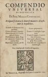 Contarini Pier Maria, Compendio universal di republica [...] nel qual si tratta le diverse maniere d'instituir le republice [sic]... In Venetia: appresso Gasparo Contarini, 1602.