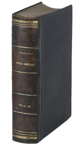 2 parti in 1 volume in-4° (mm 257x188). Pagine [2], XIII, [1], 382 con 3 tavole calcografiche fuori testo; [2], 273, [3], con 2 tavole incise in rame fuori testo. Restauro nel margine interno del frontespizio della seconda parte e altri minimi difetti, ma bella copia marginosa e con alcuni fascicoli in carta azzurrina. Legatura coeva in mezza pelle con piatti in tela e titoli impressi in oro al dorso. La prima parte ha come titolo Della villa di Marte, Casa e Lari dell'imperator de' romani P. Elvio Pertinace ne' celto-liguri-tanarei e la seconda Pinacoteca o sia Descrizione storica e critica della galleria di quadri del conte Vincenzo Deabbate.