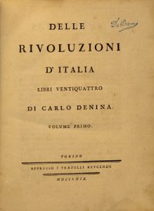 Denina Carlo, Delle rivoluzioni d'Italia libri ventiquattro [...] Volume primo (-terzo). Torino: appresso i fratelli Reycends, 1769-1770.