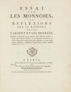 Dupré de Saint Maur Nicolas François , Essai sur les monnoies ou reflexion sur le rapport entre l'argent et les denrées. A Paris: chez Jean-Baptiste Coignard et De Bure, 1746.