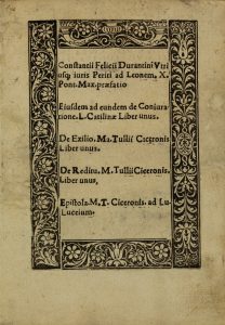 Felici Costanzo, Ad Leonem X Pont. Max. Praefatio. Eiusdem ad eundem De coniuratione L. Catilinae liber unus. De exilio. Ma. Tullii Ciceronis liber unus... (Al colophon:) Impressum Romae: per Iacobum Mazochium, 1518.
