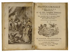 In-12° (mm 150x85). Pagine [24], 448, 31, [1] con 1 tavola nel testo e 71 tavole fuori testo (12 raffigurazioni di abiti di nobili veneziani e 59 tavole di stemmi). Marca tipografica xilografica al frontespizio. Arrossature diffuse ma leggere alle carte, una macchia d'inchiostro alla carta I3. Legatura in piena pergamena con titolo in oro su tassello al dorso. Nota di possesso manoscritta ripetuta a sguardia e occhietto. SI AGGIUNGE: Protogiornale per l'anno MDCCLXXVIII ad uso della serenissima dominante città di Venezia...In Venezia: presso Giuseppe Bettinelli, 1778. In-12° (mm 145x100). Pagine XVI, 48, 144. Antiporta incisa in rame. Tracce d'uso alle carte, restauro al verso dell'antiporta, una macchia al margine inferiore interno delle prime carte. Legatura in piena pergamena con titolo manoscritto al dorso. Ex-libris al contropiatto anteriore. (2).