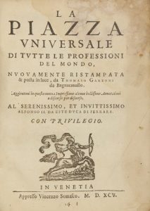 Garzoni Tommaso, La piazza universale di tutte le professioni del mondo, nuovamente ristampata... In Venetia: Appresso Vincenzo Somasco, 1595.