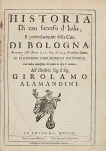 Ghirardacci Cherubino, Della historia di Bologna, parte prima [...]. Con un catalogo de' sommi pontefici, imperatori romani & regi di Toscana. In Bologna: per Giovanni Rossi, 1596.