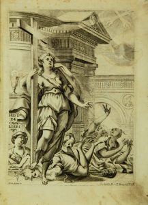 In-4° (mm 240x175). Pagine [16], 439, [1] con 1 antiporta, 1 ritratto del Dedicatario e 1 dell'Autore in principio di volume, il tutto in calcografia. Testatine, capilettera e finalini incisi in legno, illustrazioni xilografiche nel testo. Macchie marginali alla carta di ritratto dell'Autore, altre leggere gore alle prime carte ma per il resto esemplare completo e in buone condizioni. Legatura settecentesca in piena pergamena con titolo impresso in oro su tassello di pelle al dorso. Sguardie rinnovate. Ex-libris al verso dell'antiporta. Prima edizione. Incisioni disegnate da Isabella Piccini e realizzate da Giovanni Antonio Lazzari. Graesse III, 90.