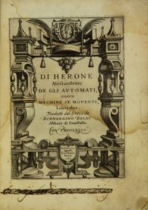 Hero (Alexandrinus), De gli automati, overo machine se moventi, libri due, tradotti dal greco da Bernardino Baldi Abbate di Guastalla. In Venetia: appresso Girolamo Porro, 1589.